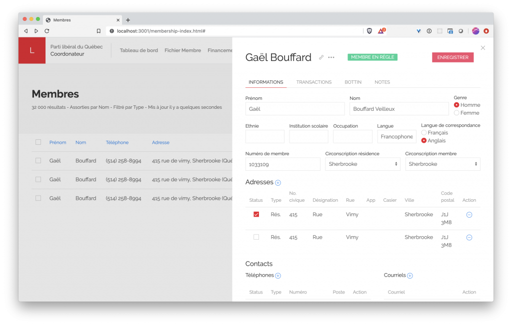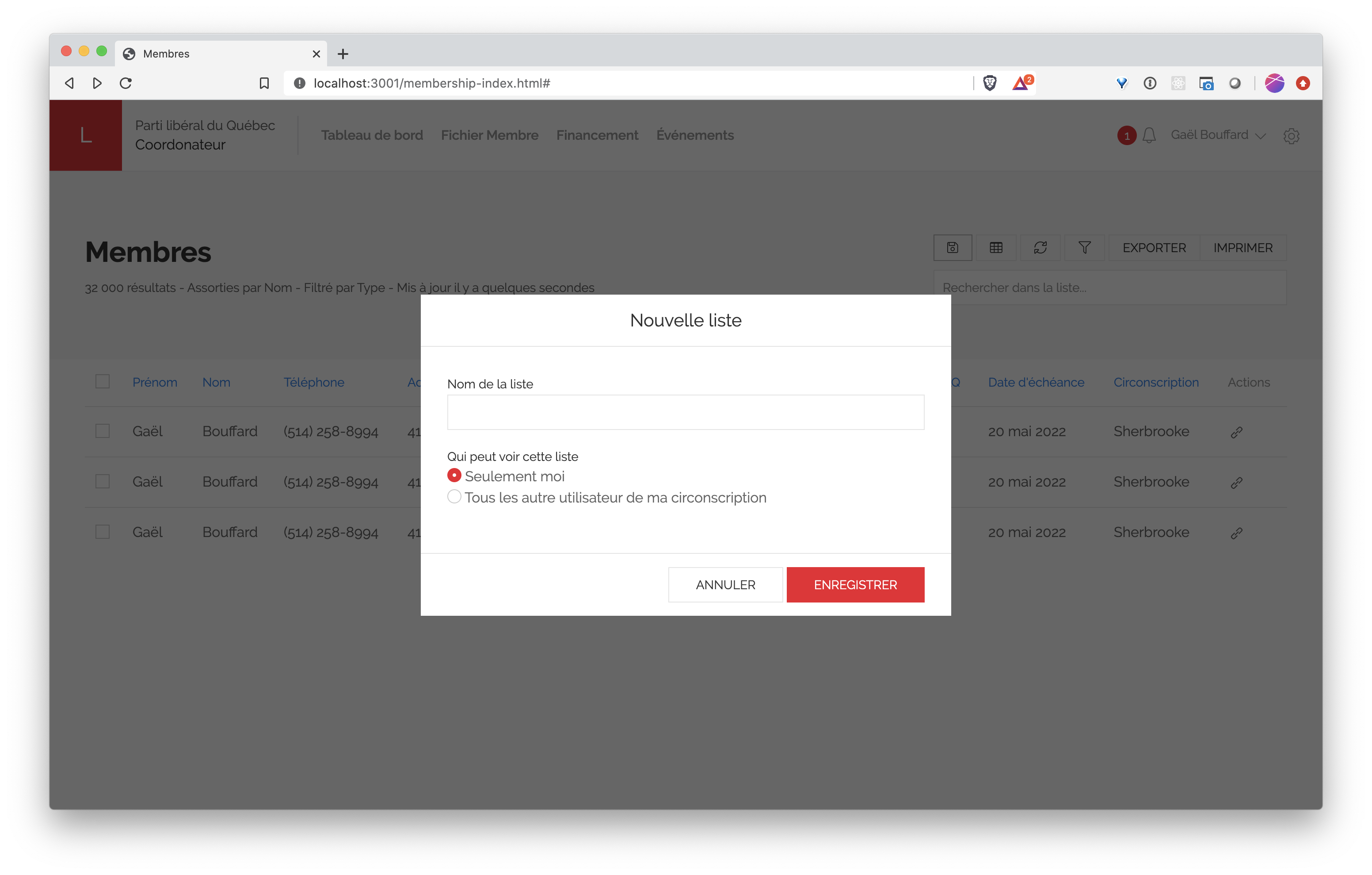 Conception d'un CRM pour une gestion optimisée des membres, du financement et des événements du PLQ.