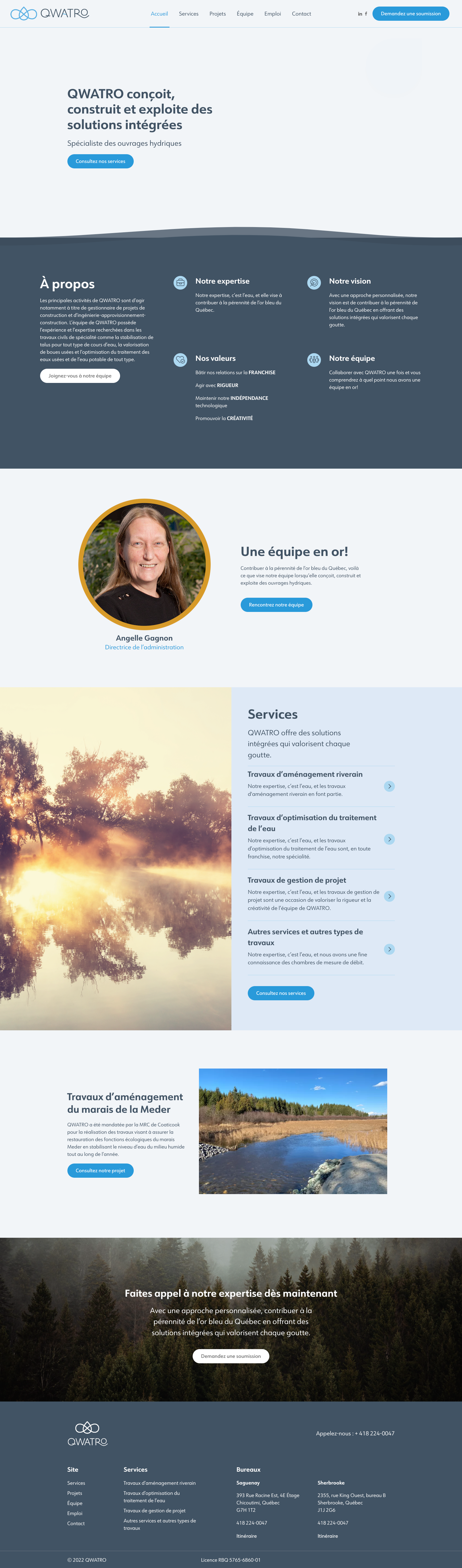 En tant que développeur web pour QWATRO, spécialiste des ouvrages hydriques, j’ai élaboré une plateforme numérique personnalisée qui illustre l’expertise de l’entreprise dans la gestion de l’eau. Le design sur mesure crée sous WordPress reflète la modernité et l’efficacité des solutions de QWATRO, avec un accent mis sur une expérience utilisateur fluide et une navigation intuitive. J’ai implémenté des fonctionnalités telles qu’un système de gestion de projets, une galerie de projets interactifs et un SEO robuste pour assurer une visibilité optimale sur le web.